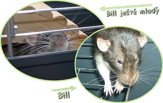 Asi před 4 lety si sestra po morčatech pořídila potkánka. Byl to dumbík, šeďivo černý ( lépe to určit nejde ) , jmenoval se Bill a koupila si ho ze zverimexu - jedna paní prodavačka měla dumbo mimča a tohle byly ty její. Především proto, že sestra svého potkánka zanedbávala, chodil jsem občas k ní do pokoje já, abych mu vhodil do klece nějakou dobrotu. To byl asi začátek mého "potkanářství". Potkánek Bill se dožil 2 let a nakonec umřel ( nevzpomínám si příčinu ).